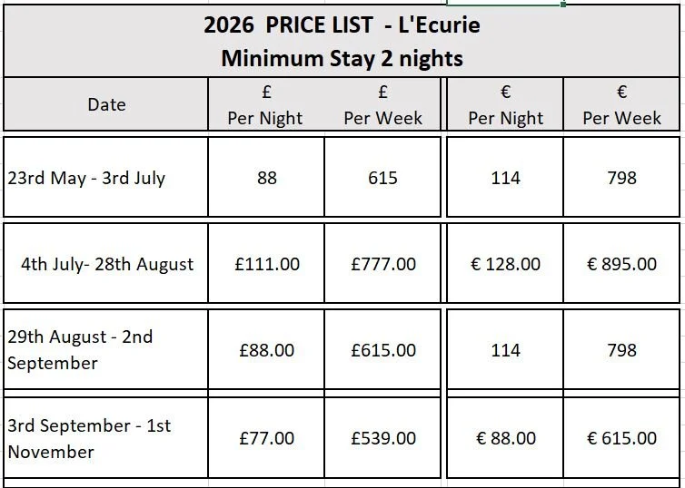 Babies & Toddlers: We are happy to accept babies and toddlers in L’Ecurie. Baby and toddler equipment is available on request at no charge - travel cot, high chair, changing mat, washable soft toys.